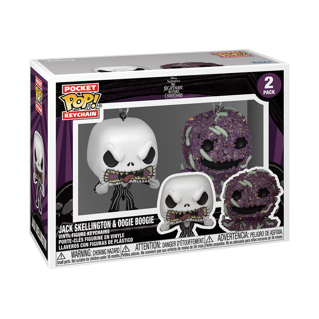 Qu'est-ce que c'est ? PORTE-CLÉS POP ! Jack Skellington et POP ! Keychain Oogie Boogie sont là pour apporter l'esprit d'Halloween à votre collection ! Ce pack de 2 est tout simplement destiné à faire partie de votre collection « Les Griffes de la nuit avant Noël » !